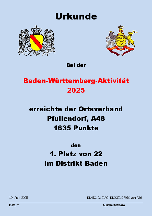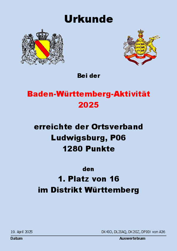 | OV-Wertung | [Nur für OVs aus den Distrikten Baden und Württemberg]. Über alle Sektionen Punkteberechnung nach der Formel der DARC Clubmeisterschaft. Alle Logs eines OVs werden gewertet. Stationen mit Sonder-DOK zählen nicht zur OV-Wertung. |