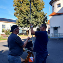 Die Kurzwellenantenne wurde diesmal jedoch am Mehrgenerationenhaus in Mühlhausen auf einem mobilen Glasfasermast mit 12m Höhe gespannt.