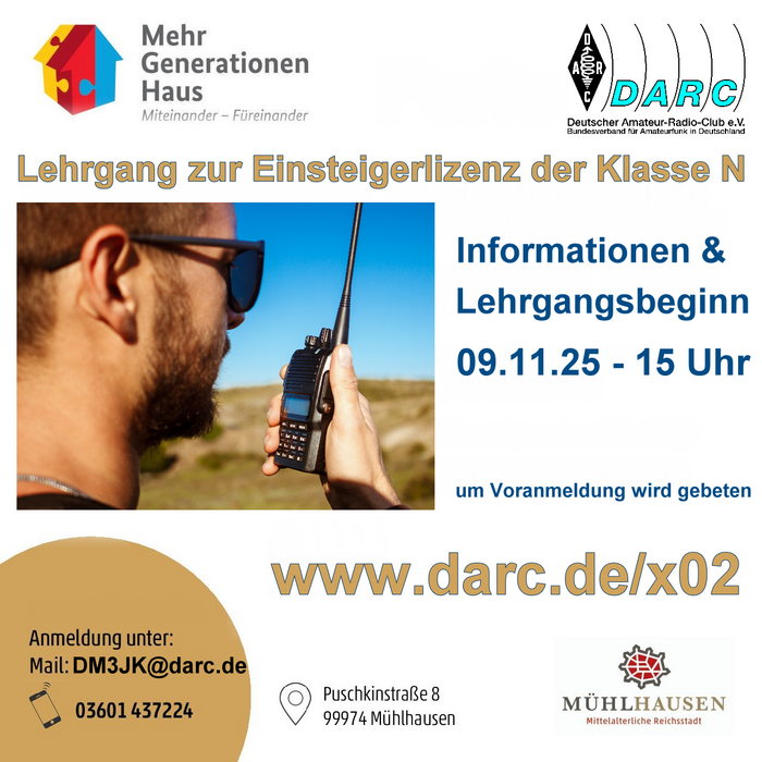 DM3JK vom Ortsverband Mühlhausen X02 bietet ab 09.11. 2025 einen Präsenzkurs zum Erwerb der Lizenzklasse N an. Der Lehrgang findet jeweils Sonntags in Mühlhausen im MGH statt.