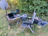Die beste Entscheidung war am Freitag die Zelte aufzubauen, denn darunter ließ es sich gut sitzen und von den Strapazen erholen. So konnte der Samstag kommen. Wir hatten eine End fed-Antenne und den Hex-Beam inkl. Mast und Abspannung für Kurzwelle und für UKW 2m eine kurze Yagi sowie für 70cm und 23cm eine X-5000 aufgebaut - ebenfalls auf einem Mast nebst Abspannung. Peter (DG2AAO) brachte im Laufe des Vormittags noch sein gesamtes Equipment für die OSCAR-100 Satelliten-Verbindung mit. Thomas (DG5TS) hatte seinen Grill und Kohle mitgebracht und Bene (DF8BP) verkabelte die Geräte mit den Antennen. Selbst eine Kaffeemaschine mit Trinkwasser im Kanister sowie Milch und Zucker brachte Adnan (DL5ART) mit. Pünktlich um 13 Uhr war alles und alle fertig.