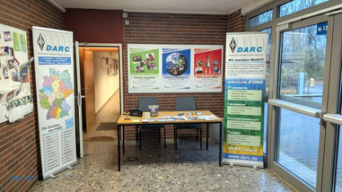 Die Funkamateure DN9VV, DO2NCF, DF1CF, DO1PR und der betreuende AG-Lehrer DN9DIR gaben einen Einblick in die Funkaktivitäten auf Kurzwelle und UKW. Ein besonderes Highlight war dabei die neue QO100-Satellitenfunkstation, welche mit einer Spende der ALANOD-Stiftung in diesem Jahr errichtet werden konnte. Sie trägt zu einer deutlichen Verbesserung der Ausbildungssituation bei und stärkt das MINT-Profil des RGEs.