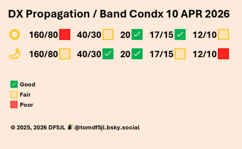 Vorhersage bis 14. April: Die sechs Sonnenfleckengruppen befinden sich alle in der westlichen Hälfte und nähern sich dem Rand. Eine neue Region ist am östlichen Sonnenrand zu erkennen. Wir erwarten eine ruhige Sonne und Fluxwerte zwischen 100 und 110 Einheiten. Die Wahrscheinlichkeit für M-Flares beträgt noch 35 Prozent. Das geomagnetische Feld wird zeitweise gestört sein, besonders zwischen dem 10. und 13. April. Diese Entwicklung wird sich auch in niedrigeren MuF2-Werten und in mäßigen Ausbreitungsbedingungen zeigen. Tagsüber sind die besten Bänder 17 und 15 m, nachts 40, 80 und 30 m. Über den langen Weg ist der Südpazifik morgens noch stabil erreichbar.