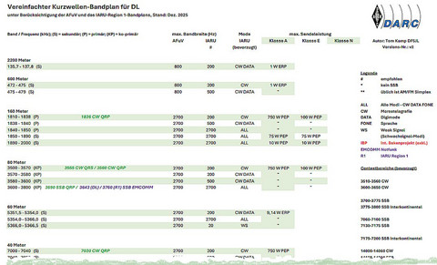 Das HF-Referat hat einen neuen, vereinfachten Kurzwellen-Bandplan für Deutschland veröffentlicht, der sich an OPs, SWLs und Kurzwellen-Enthusiasten richtet. Dieser enthält unter anderem Angaben zu Frequenzen, Betriebsarten, maximalen Bandbreiten, Nutzungen sowie die zulässigen maximalen Sendeleistungen, aufgeteilt nach den jeweiligen Genehmigungsklassen in DL. Grundlage waren dabei die Amateurfunkverordnung (AFuV) sowie der Bandplan der IARU Region 1.