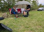 Dort angekommen wurden wir auch sofort sehr nett begrüßt von OM Tom, DL5NEN. Und obwohl er wegen des drohenden Sturms während der Nacht nur sehr wenig geschlafen hatte, beantwortet er alle unsere Fragen als Erstbesucher des YFD ausführlich. Er erzählte uns Hintergrundinfos zur Organisation der Veranstaltung, zu den verschiedenen angebotenen Stationen des "Agententrainings", zum imposanten Mast mit der Cubical quad und dem hervorragend gestalteten Geheft für die Kinderagenten.