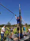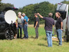 Die nur 11 Kilo schwere Antenne wurde schließlich über die Hecke geliftet und an der bereitstehenden Hebebühne festgezurrt. Ein erster Empfangs-Check, dann ging es in luftige Höhen. Die Montage auf dem Dach des OV-Heims klappte problemlos und nach einem langen, arbeitsreichen Arbeitstag waren alle mit dem Ergebnis recht zufrieden und auch ein bisschen stolz auf das gelungene Werk.