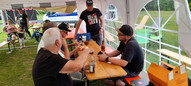und viele mehr eine beträchtliche Infrastruktur aufgebaut. Vom erstmalig aufgerichteten Festzelt, das eigens angeschafft wurde, bishin zur Spülmaschine und mehreren Kühlschränken war alles zu finden. Das Highlight, der Praxistest der diesjährigen Fielddayantenne verlief ebenso erfolgreich. Mit rund 80m Spannweite füllte der Fächerdipol den gesamten Festplatz aus und sorgte für viele begeisterte Blicke. Mit dem Grillbetrieb rund um die Uhr konnten viele Besucher am OV-Abend und den darauffolgenden Tagen versorgt werden und dem Vortrag von Matthias DO1BLK über die Strukturen des Stromnetzes folgen. So erfuhr der Abend erst spät einen ruhigen Ausklang. Der Samstag bot bis zum Nachmittag hervorragendes Wetter, doch wurde dieses später durch starke Windböen und Regen abgelöst, weshalb die Funkstation (ein einfacher Pavillion) aufgegeben werden musste und ins Hauptzelt versetzt wurde. Dort war sie im massiven Aufbau sicher vor sämtlichen Umwelteinflüssen. Am Sonntag konnte der FoxOringwettbewerb, von Kai DK1TEO organisiert, viele Teilnehmer locken, die einen zwanzigminütigen Wettlauf durch den nahegelegenen Wald auf sich nahmen. Mit dem Abbau am Sonntagnachmittag ging der Fieldday zu Ende, welcher sehr schöne Stunden mit Freunden bescherte.
