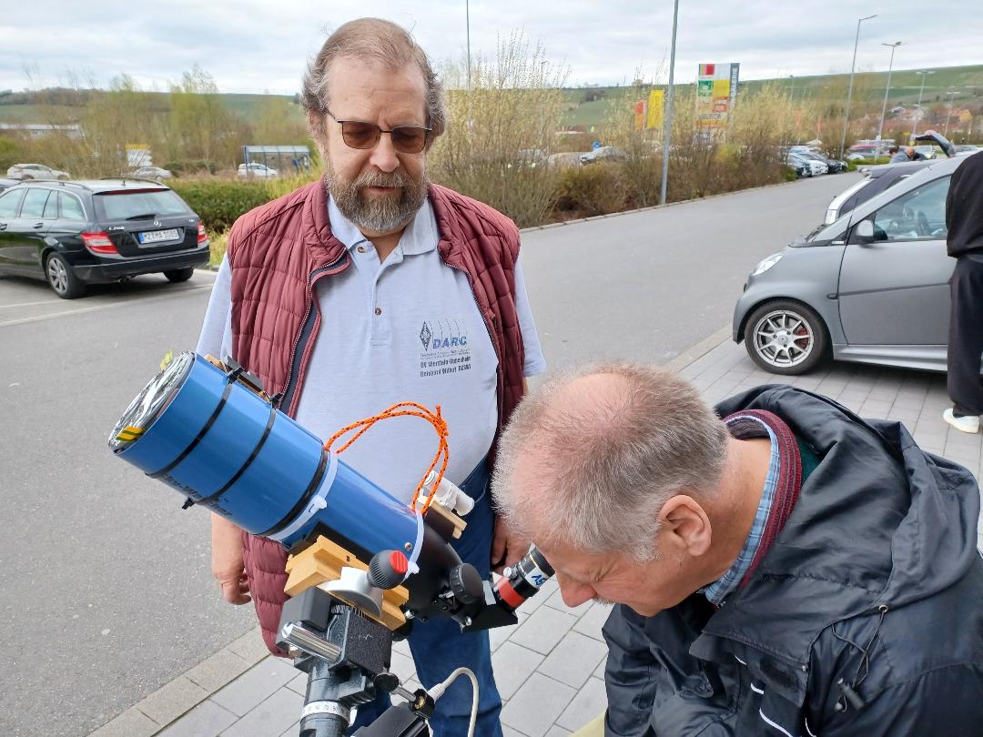 Reinhard DC8WV und Eberhard DL3WA konnten die astronomischen Geräte zur besten Einkaufszeit vor dem Eingang eines großen Einkaufscenters ausstellen. Leider gab es nur wenige Wolkenlücken aber viele Besucher blieben stehen und so konnte man ins Gespräch kommen. Natürlich war auch zwischendurch die Sonne zu sehen. Kurz nach dem Maximum war der Himmel aber total bedeckt. Reinhard bemerkte dazu: Wir haben eine totale Sonnenfinsternis und Mondfinsternis auf einmal gesehen - eine astronomische Sensation :-). Der OVV von K 33, Michael DB5COA: Der OV K 33 nutzt schon seit Jahren jede passende Gelegenheit, um in der Öffentlichkeit präsent zu sein. Das zahlt sich aus: K 33 ist inzwischen bekannt.