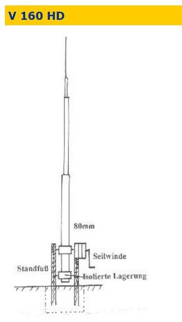 Die Titanex V 160 HD (160 m vertical - selbsttragend /26,7 m hoch/ ohne Abspannung / mit Seilwinde zum Aufstellen) ist eine Vertical Antenne für 160 / 80 / 40 m Band.