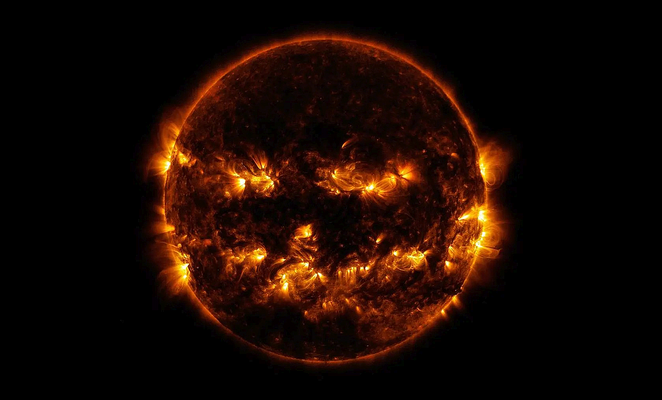 Aktive Regionen auf der Sonne bildeten am 8. Oktober 2014 zusammen etwas, das wie das Gesicht einer Kürbislaterne aussah. Quelle: NASA.