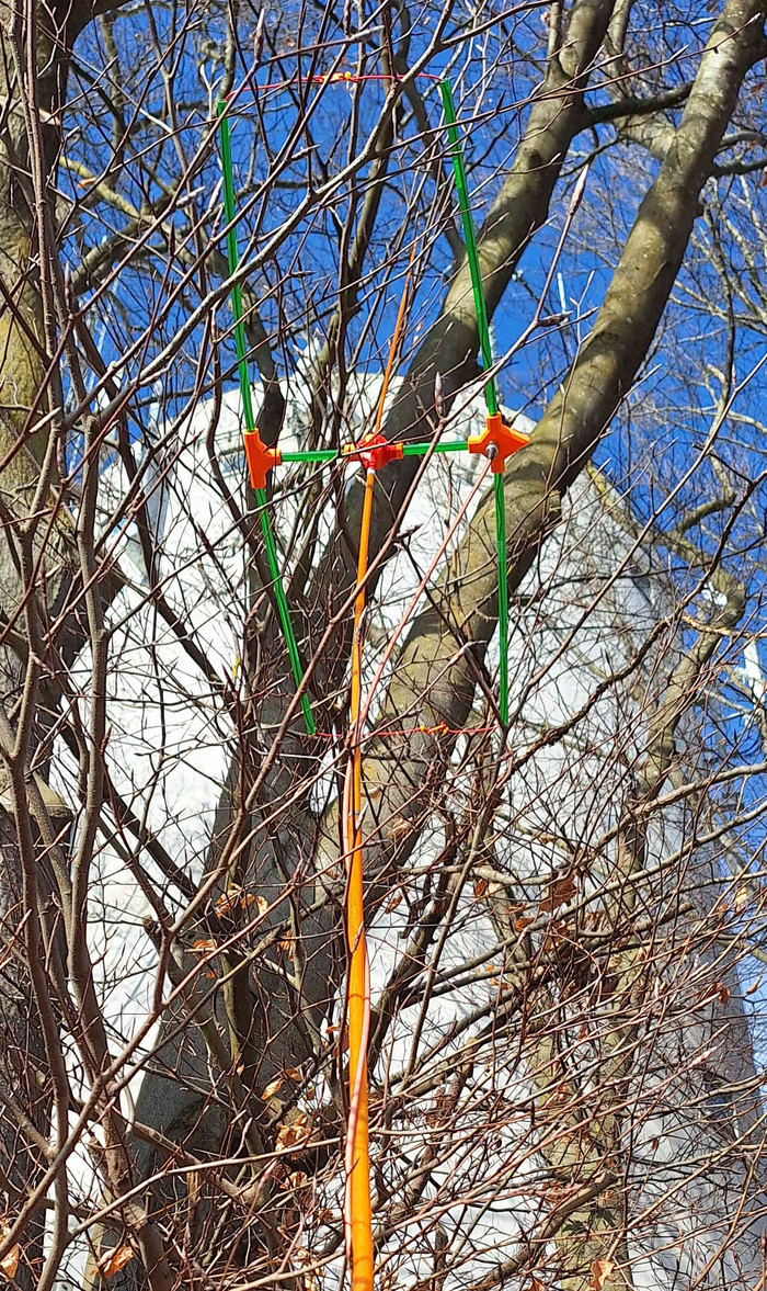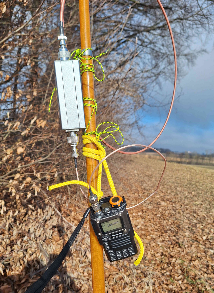 Kurz vor Beginn des Wettbewerbs lief ich zum Adelsberg und baute meine Station auf.Ich hatte die 6m Angel und eine 4m Angel als Mast dabei. Leider passte die Mastspitze der 6m Angel nicht in das Loch der Moxon Antenne. Also nahm ich den 4m Mast. Mit etwas Klebeband wurde die Moxon am Mast fixiert, damit ich die Antenne problemlos ausrichten konnte. Schnell noch das Filter und das Handfunkgerät am Mast mittels Bändseln befestigt und alles mit den Koaxial Kabeln verbunden. Die Station war bereit für den Contest