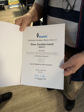 Als erstes wurde Joachim Bast DK6LQ von Mike geehrt. Joachim ist seit 1969 Mitglied im DARC.