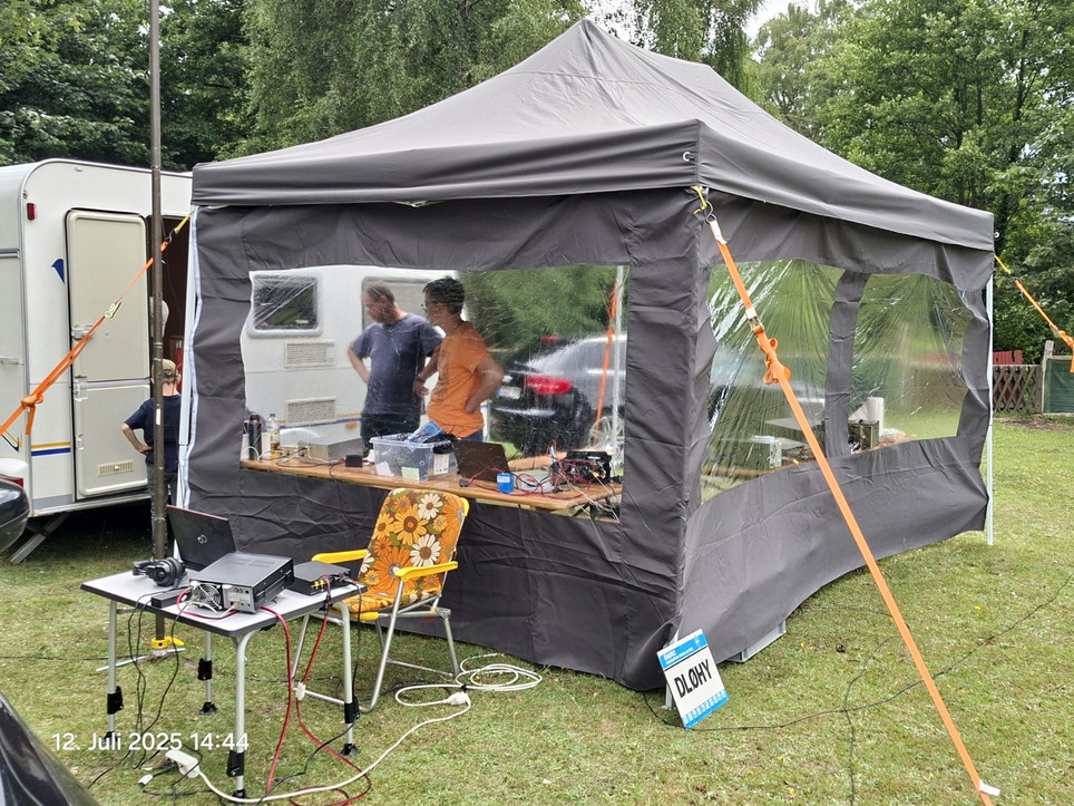 Der Aufbau des neuen OV - Pavillons und den Biertischgarnituren von Helge, DK2KAH war schnell erledigt. Die OV - Groundplane war ebenfalls nach kurzer Zeit errichtet und einsatzbereit. -