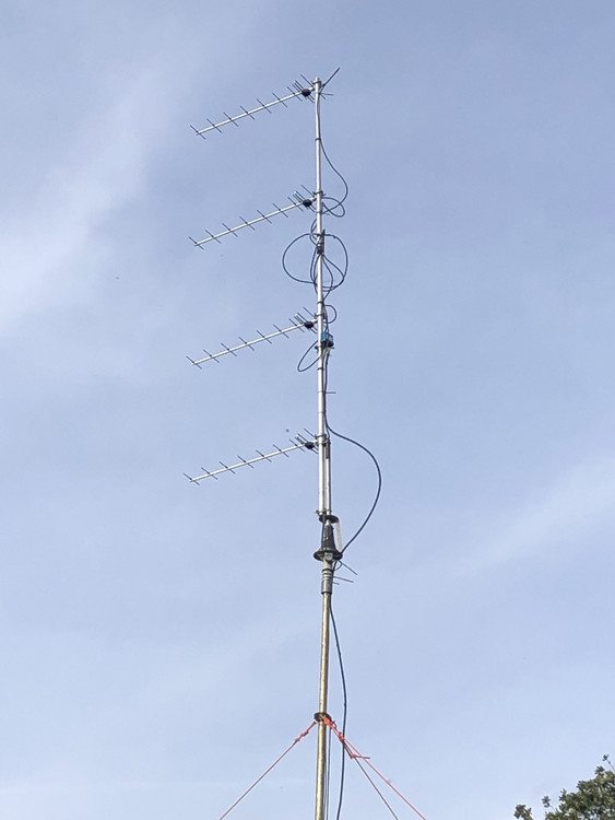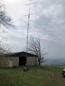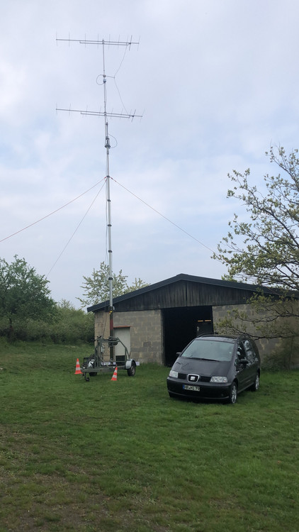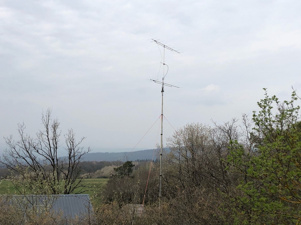 Mit den Erfahrungen aus den seit Herbst 2020 durchgeführten 2-m-Wettbewerben hatten wir einige Verbesserungen an der Station vorgenommen. Als Antenne auf dem mobilen Kurbelmast kam jetzt statt der bisherigen 10-Ele.-Antenne eine gestockte Gruppe aus 2x9 Elementen, die Wilhelm DK6FI, Andre DO2AMH überlassen hatte, zum Einsatz. Heinz, DK4EI hatte die dafür benötigten 500W Symmstrierschleifen zusammengelötet und auch den Koppler für die Zusammenschaltung der beiden Antennen besorgt. Vor dem Contest war die neue Antennenanlage einem ausgiebigen Test unterzogen worden. Gewinn- und V/R-Verhältnis entsprachen dabei den berechneten Werten. Gegenüber der bisher verwendeten Yagi ergibt sich ein Gewinn von 3dB und ein erheblich flacherer Abstrahlwinkel. Das wiederum hat zu Verminderung der Störungen aus verschiedenen Quellen in tieferen Lagen rund um den Mosenberg geführt.
