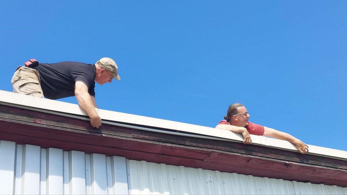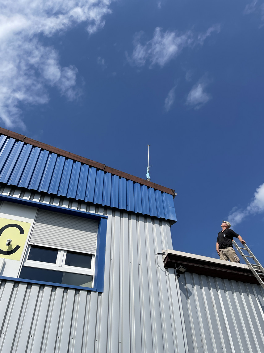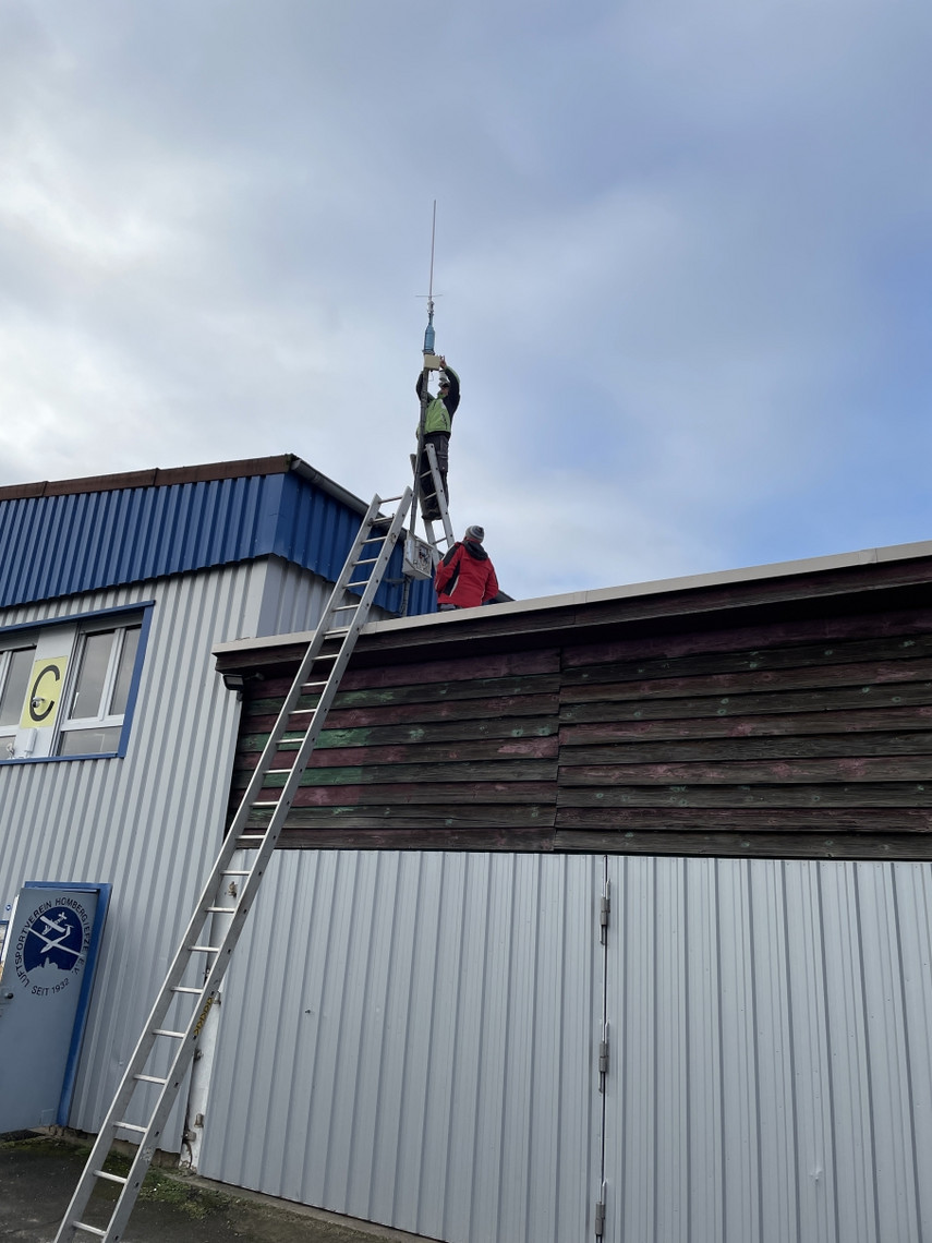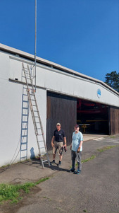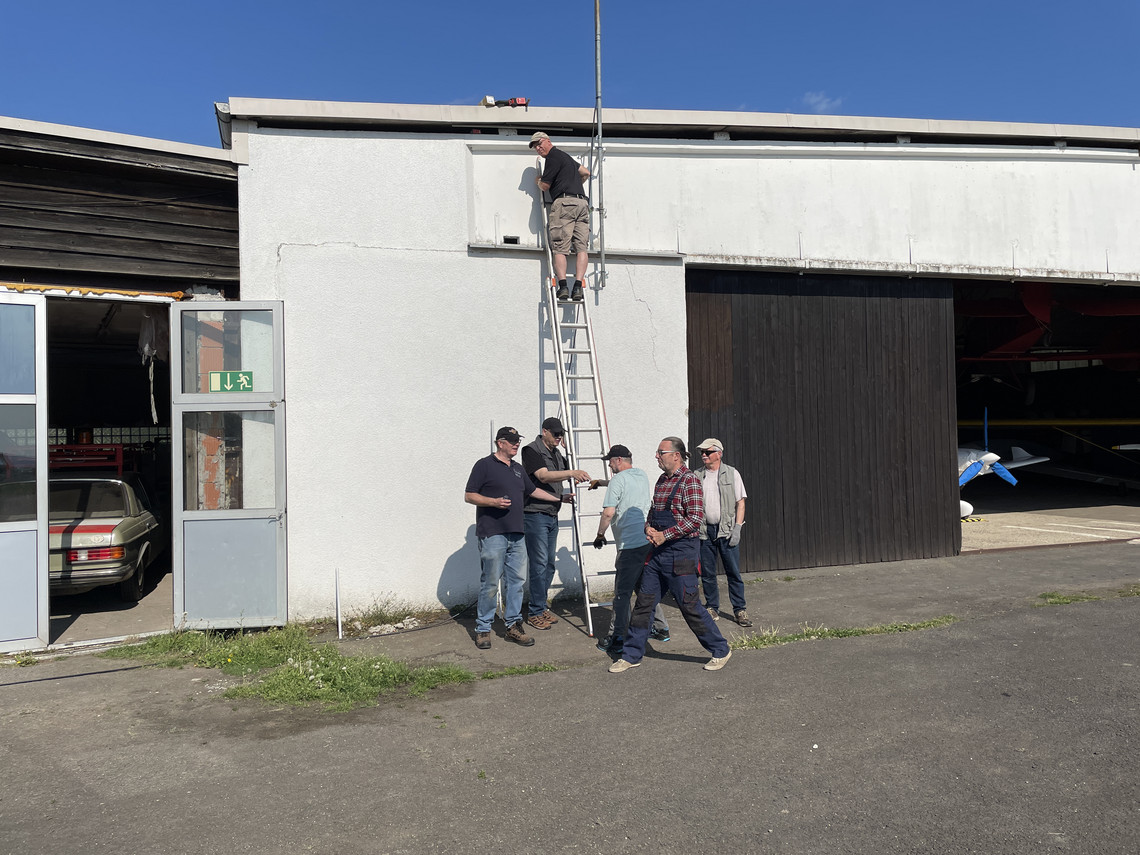 Ende des Sommers 2024 hatten wir dort die 2m Sperrtopfantenne in Betrieb genommen und dabei das lange Antennenkabel zunächst nur provisorisch verlegt. Leider erlaubte die Wettersituation und die Verfügbarkeit unserer Funkfreunde im letzten Jahr nicht mehr, das Kabel noch wie gewünscht in einem Leerrohr entlang des Daches des Flughafengebäudes zu verlegen.
