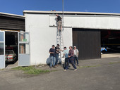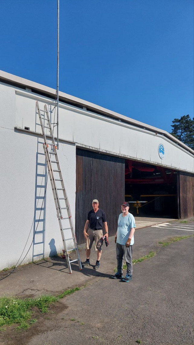 Nachdem sich die neue Position der 2m Sperrtopfantenne unseres Relais DB0MEG in den Tests der letzten Wochen bewährt hat, stand jetzt die endgültige Montage am Flughafengebäude in Mosenberg an. Andre (DK5HI), Jan (DO8JAN) und unser Relaisverantwortlicher Dieter (DL8FBP) befestigten die Antenne mit drei Haltewinkeln am Gebäude. Dabei wurden sie tatkräftig unterstützt von Julian. Vielen Dank auch an ihn!
