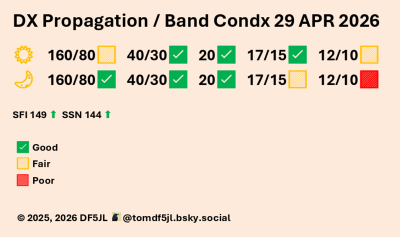 Die Sonnenaktivität ist moderat, weitere M-Flares werden erwartet, mit einer geringen Wahrscheinlichkeit auch X-Flares (M 70%, X 20 %). Zunächst bleibt die geomagnetische Aktivität ruhig, in der Nacht (UTC) dann unbeständig bis aktiv (Kp 3-4), mit geringer Wahrscheinlichkeit auch stürmisch (Kp 5). Bis dahin meist gute KW-Bedingungen.