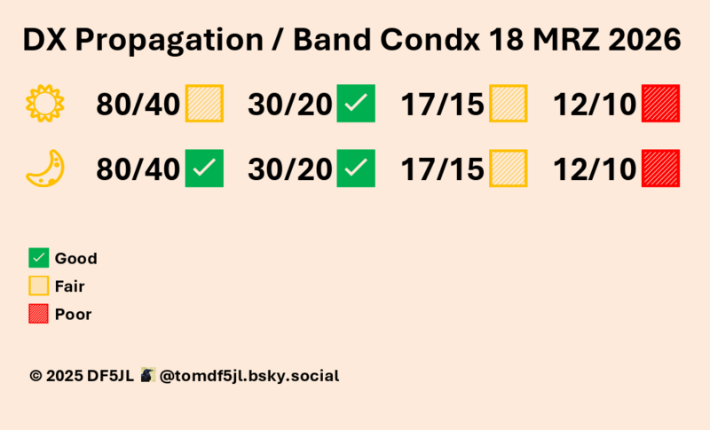 Die geomagnetische Aktivität wird überwiegend ruhig sein, am Donnerstag stürmisch (Kp 5-6) aufgrund einer CME. Die Sonnenaktivität ist gering, mit vereinzelten M-Flares ist zu rechnen (M 35 % X 05 % Proton 05 %). Brauchbare, teils gute HF-Bedingungen. - ZCZC 180530UT MRZ26 QAM SFI111 SSN72 eSFI108 eSSN60 KIEL A6 K(3H)1 SWS423 BZ1 BT5 HPI16 DST14 KP4CAST(3D) MAX 2/3 6 5 MUF3000 MAX24+(D) MIN9(N) DATA BY SWPC/NOAA SANSA S-AFRICA WDC/KYOTO MET OFFICE UK KMI DOURBES GFZ POTSDAM NNNN
