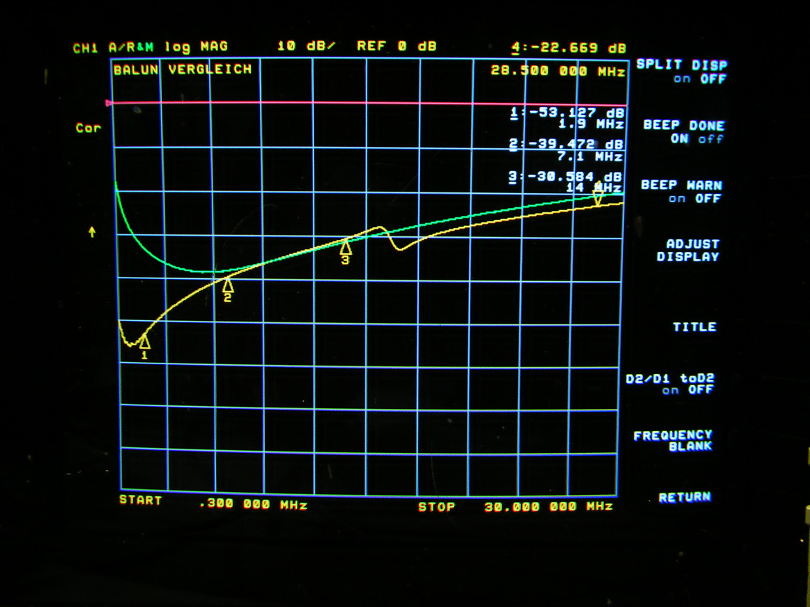 Das erste Bild zeigt den Vergleich eines Fritzel 83 von Henri (grün) mit unserem Balun (gelb). Die Meßpunkte: 1: 1,9MHz; 2: 7,1MHz; 3: 14MHz.