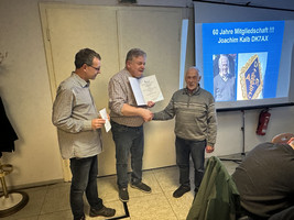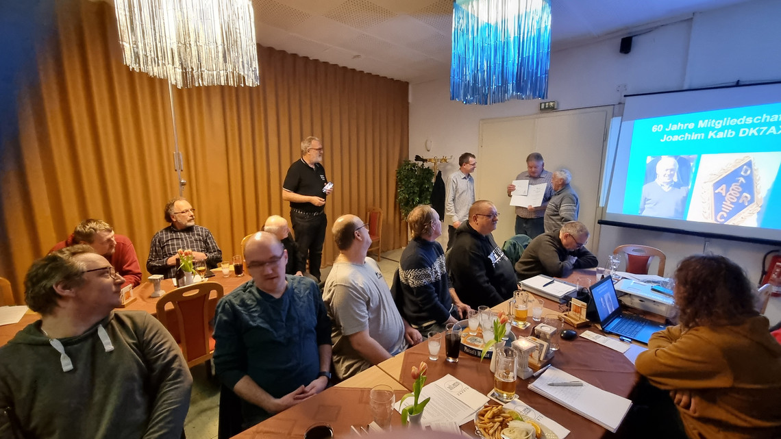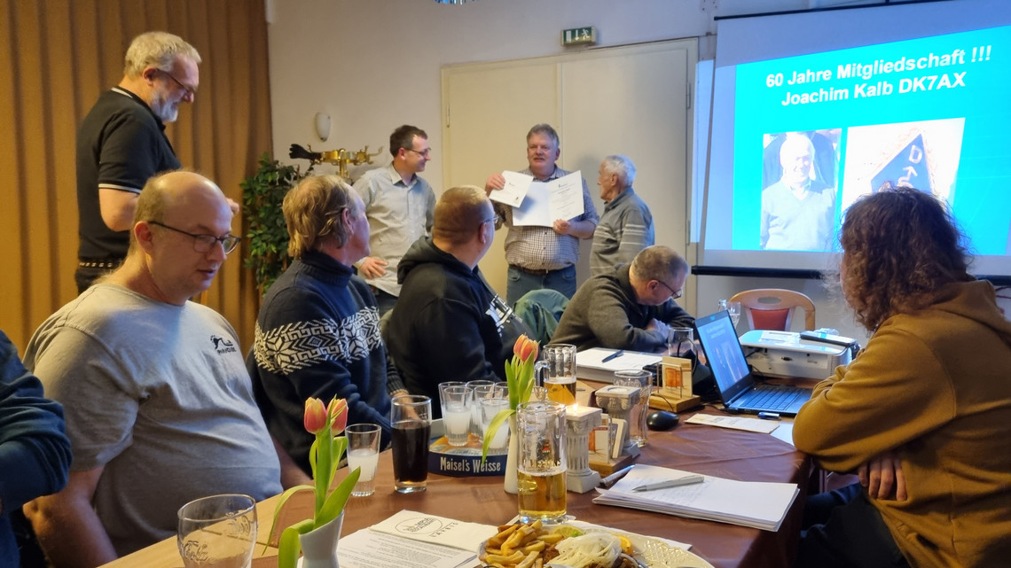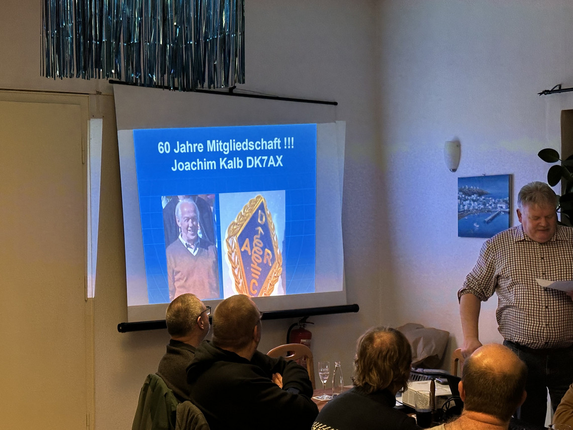 Für 60 jährige Mitgliedschaft wurde Joachim Kalb, DK7AX geehrt. OVV Oliver Häusler DH8OH und der stellvertretende OVV Marco Dittmann, DL9AM überreichten ihm die Ehrenurkunde des DARC, sowie die Nadel für 60 jährige Mitgliedschaft im DARC.