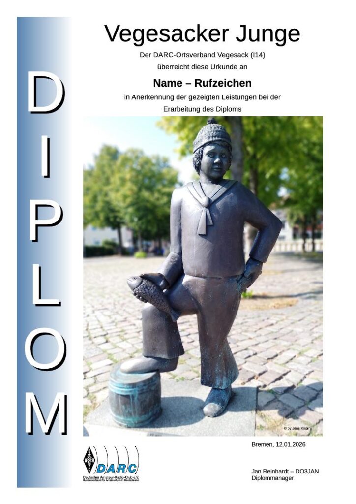 Pünktlich zu Jahresbeginn 2026 freut sich der Ortsverband Vegesack mitteilen zu können, dass das Diplom „Vegesacker Junge“ eine Renaissance erlebt und in einer neuen Aufmachung erscheint. Die Figur des Vegesacker Jungen ist eng mit der maritimen Geschichte der Region verbunden. Sie stellt einen jungen Matrosen der ehemals ortsansässigen Heringsfangflotte dar, der nach seinem Landgang seine leergefegten Hosentaschen zeigt, in der sich zuvor seine Heuer befand. Der Sage nach soll so der Ortsname Vegesack entstanden sein.
