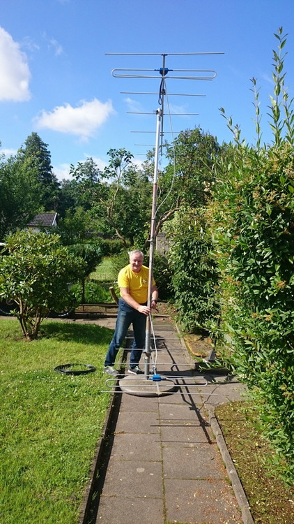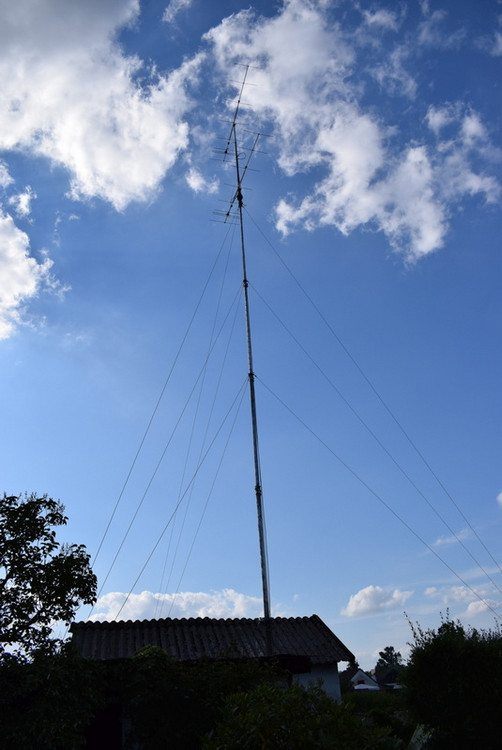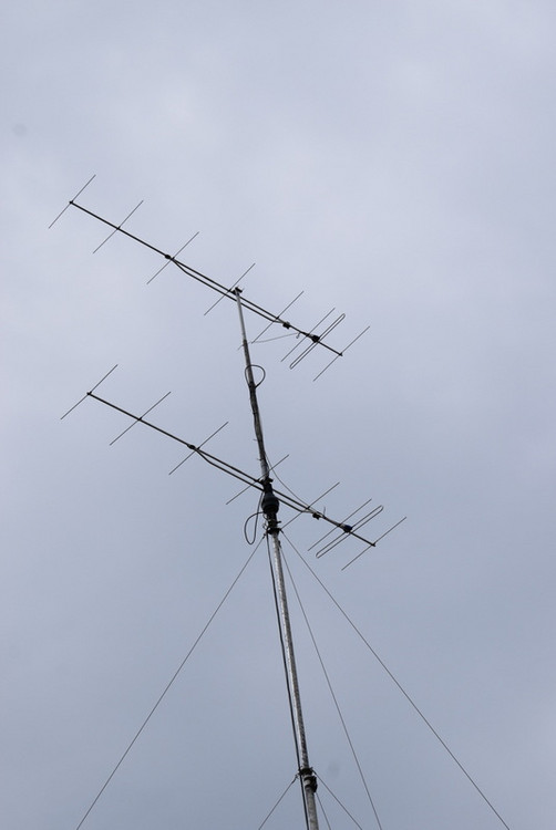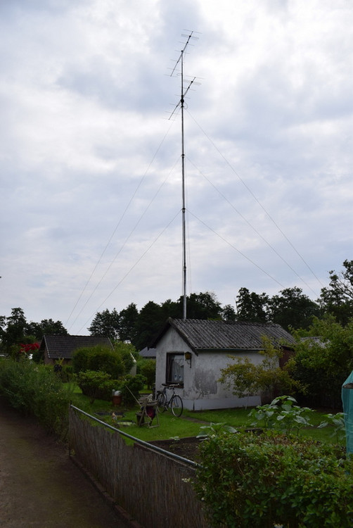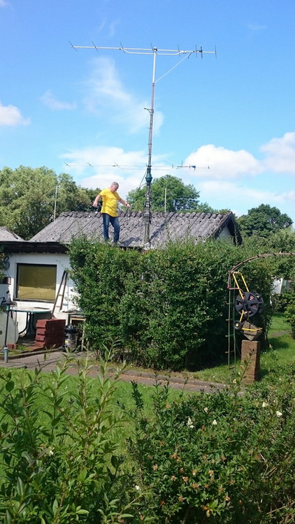 Der Standort der Station befand sich im Kleingarten von Yuri, DF1MM. Als Antenne wurde eine gestockte Gruppe aus zwei 8-Element Yagis nach DK7ZB genutzt. Der Abstand der Stockung betrug rd. 3m, die Einspeisung wurde direkt über einen Koax-T-Verteiler auf beide Antennen geführt. Nach dem Aufbau ergab die Messung ein SWR von rd. 1 zu 1,3 für den Frequenzbereich 144,0 bis 145,0. Damit waren wir zufrieden. Anschließend wurden die Antennen auf eine Höhe von ca. 18m gekurbelt.