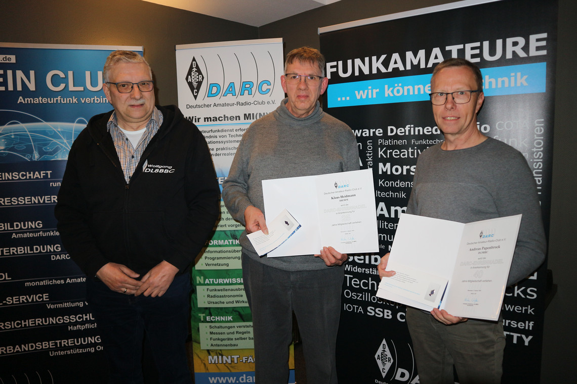 Für die langjährige Mitgleidschaft geehrt wurden Klaus Heidmann DH3BM (25 Jahre) und Andreas Papenbrock DG9BBC (40 Jahre).