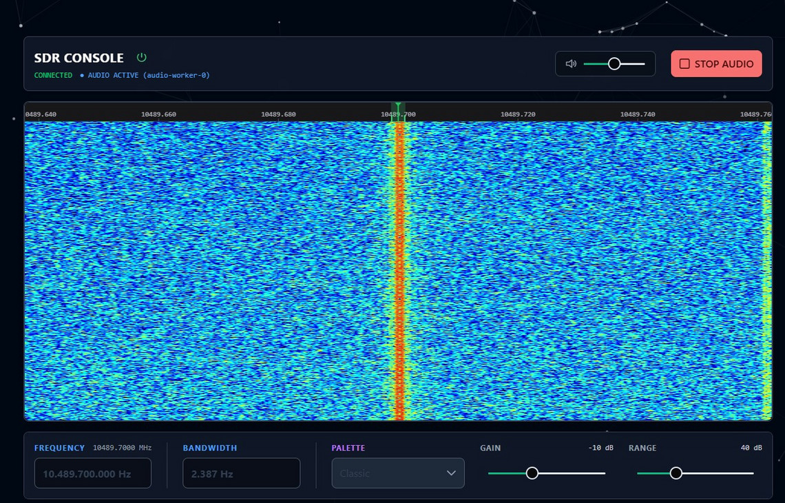 Die Studenten haben ein Web-SDR programmiert, eine Website, auf die sich jeder überall auf der Welt einloggen kann. Die Funksignale ihrer Satellitenbodenstation können über https://websdr.fbi.h-da.de/sdr rund um die Uhr im Internet verfolgt werden. Im Webbrowser erscheint das bunt eingefärbte Empfangssignal wie auf einem Messinstrument, begleitet von statischem Rauschen sowie Funksprüchen, meist auf Englisch, die auch als Balken auf dem Display sichtbar werden.