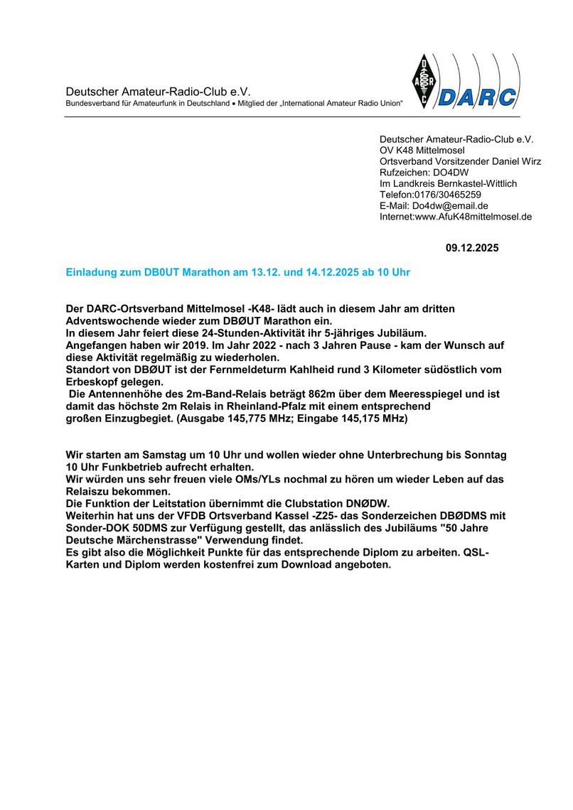 Der DARC e.V. ist die größte Vereinigung von Funkamateuren in Deutschland und Europa. Er gliedert sich bundesweit in 24 Distrikte und rund 1000 Ortsverbände. Zu den Aufgaben des Clubs zählen die Förderung des Amateurfunks und die Schaffung geeigneter Rahmenbedingungen für den Amateurfunkdienst. Wer Interesse am Amateurfunk im Allgemeinen und an Notfunk im Besonderen hat, kann sich an den DARC-Ortsverband K48 Mittelmosel wenden. info(at)afuk48mittelmosel.de