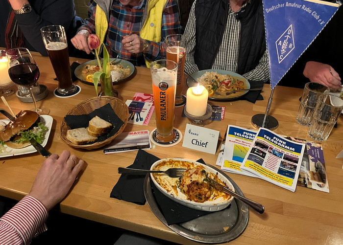 Durch die etwas kleine Gruppengröße waren die gemeinsamen Gespräche intensiver als an der langen Tafel und so wurde das ein oder andere technische Problem erörtert und mögliche Lösungen diskutiert. OVV Ulf DK5TX und der stellvertretende OVV Peter DL1YAW stellten eine mögliche Anschaffung für den OV vor, die zur Unterstützung des Portabelfunkbetriebs und für Antennenversuche zuhause gedacht ist. Da der bestehende Geroh Kurbelmast durch Gewicht und aufwändigen Aufbau eher selten zum Einsatz kommt, soll das OV-Equipment durch einen leichten und einfach aufzubauenden Spiderbeam Fiberglasmast ergänzt werden. Die anwesenden OV-Mitglieder stimmten mehrheitlich für die Anschaffung und sind gespannt auf den ersten Einsatz.
