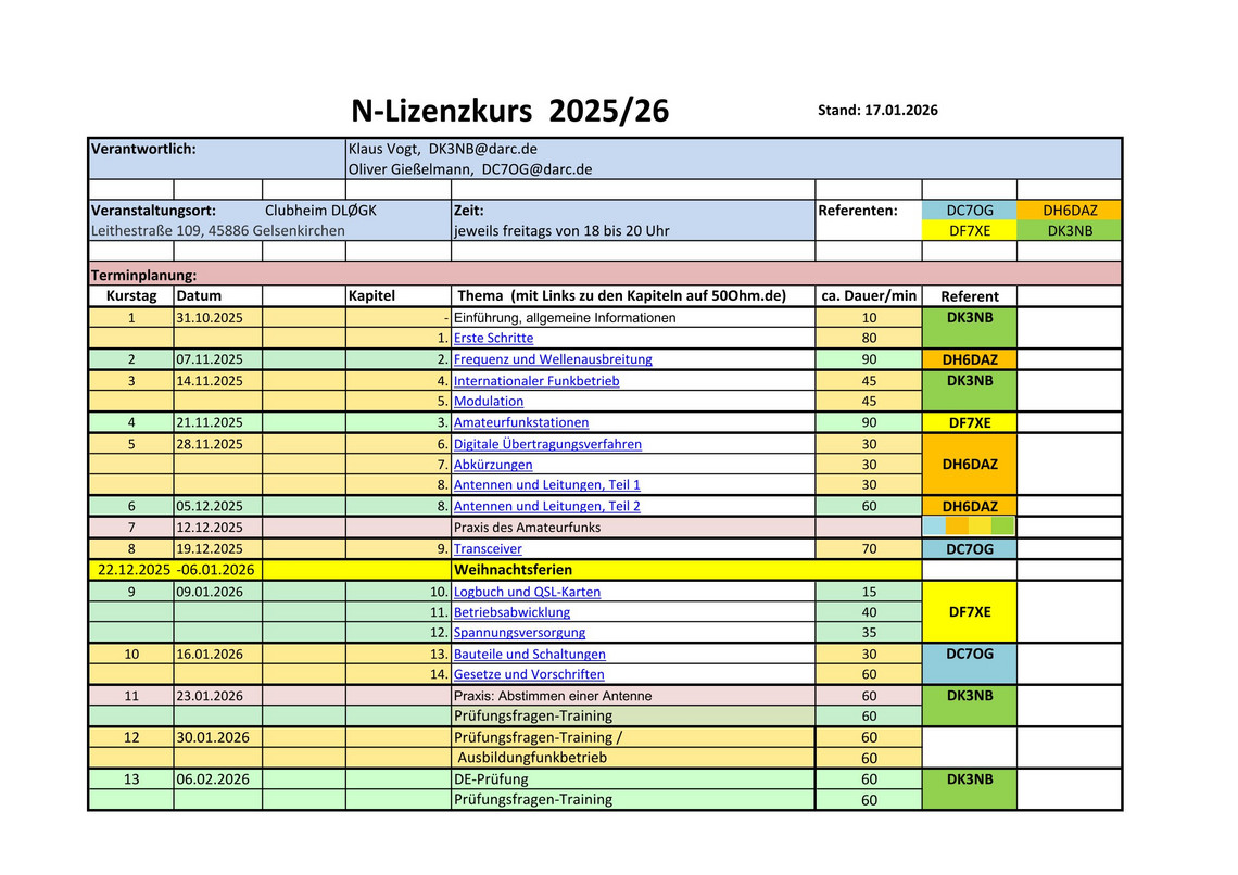 Daher bietet der DARC - Ortsverband Gelsenkirchen ab 31. Oktober 2025 einen Kurs zur Erlangung des Amateurfunkzeugnisses der Klasse N an. Er wird von einem Team erfahrener Funkamateure durchgeführt und dauert ca. 3 Monate. Der Kurs wendet sich an technisch interessierte Erwachsene und Jugendliche, ausdrücklich auch an Frauen und Mädchen, ab etwa 12 - 14 Jahren. Er behandelt Themen wie physikalische Grundlagen der Funktechnik, Basiswissen Funkgerätetechnik, Betriebstechnik und Vorschriftenwesen. Die Theorie wird aufgelockert durch praktische Übungen und Demonstrationen, unter anderem auch durch echten Amateurfunkbetrieb der Teilnehmer mit einem Ausbildungsrufzeichen an der Clubstation. Die Teilnehmerzahl ist aus räumlichen Gründen auf ca. 10 beschränkt.