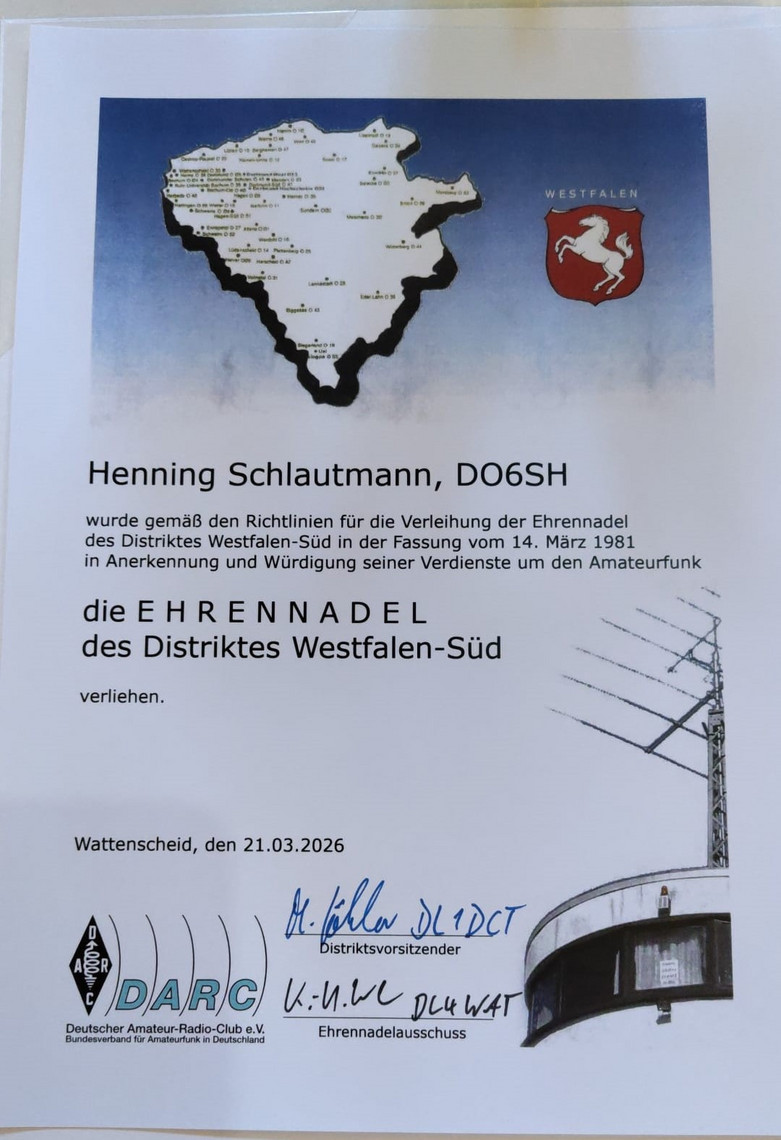 Nach der Ehrung der verstorbenen Mitglieder erfolgte die Verteilung der Ehennadeln. Unser OV-Mitglied Henning, DO6SH erhielt die Ehrennadel des Distrikts für seine engagierte Mitarbeit, insbesondere für die Mitarbeit bei der Auswertung des WSA und die kommissarische Führung des OV O54, Dortmunder Schulen.