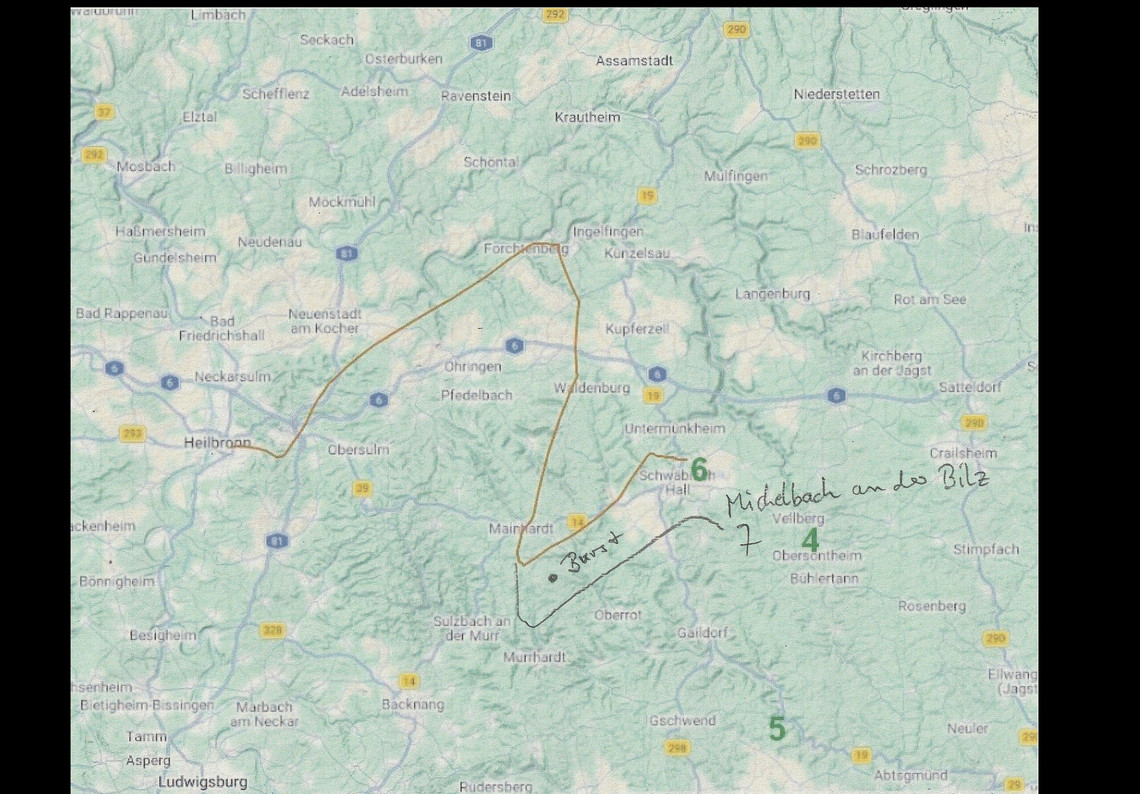 Das Bild links zeigt die Vorhersagen, die ich am 4., 5., 6. und 7.2. gemacht habe. Der Ballon sollte also bei Michelbach nach einer Flugzeit von knapp über 2 Stunden landen. Es war aber nach dem geplanten Start um 11 Uhr nichts vom aprs-Signal zu hören (144,800 MHz) noch zu sehen (aprs.fi). Auch auf DB0HN war es ruhig.