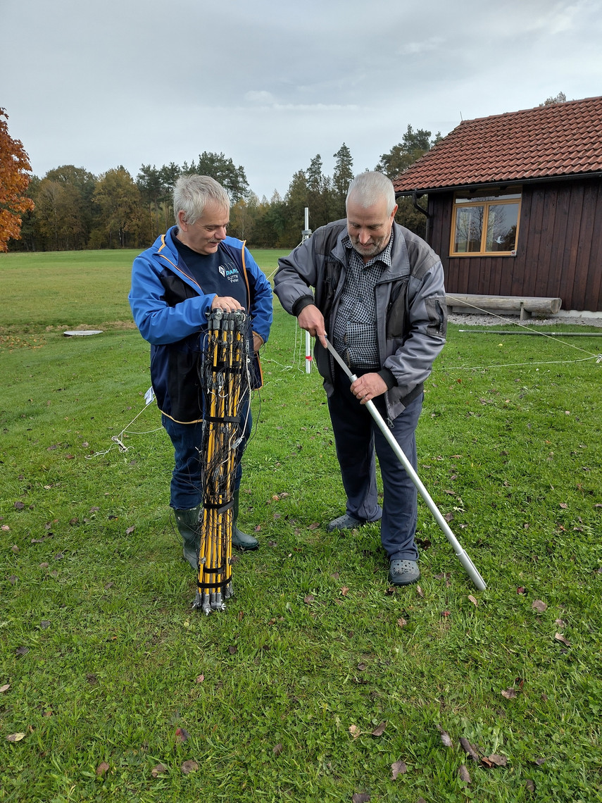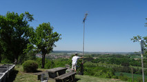 Peter und Gerhard haben den Hexbeam am Vortag im Garten bei DF1DA auf den Bändern 20, 15 und 10 in ca 5m Höhe abgeglichen.