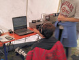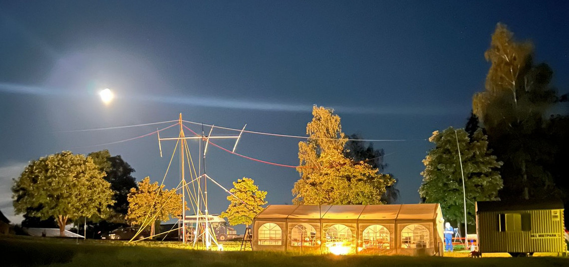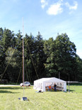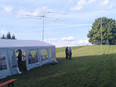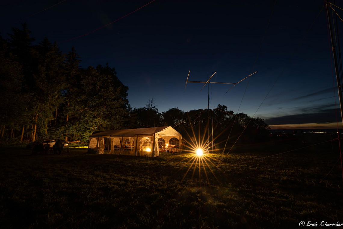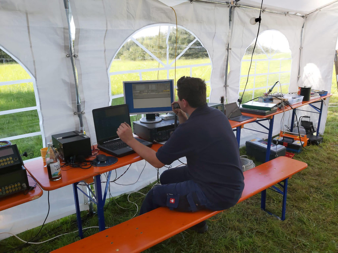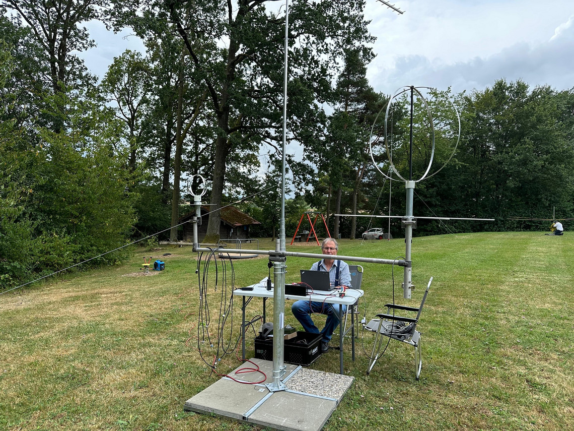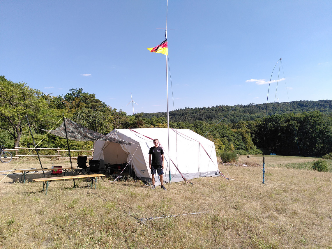 Bei sehr heißem Wetter, weit über 30 Grad, war das Auf- und Abbauen des Zeltes ziemlich schweißtreibend. Beim Aufbau hat ihm sein Freund Jannis, der noch SWL ist, geholfen.