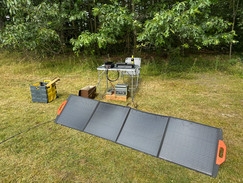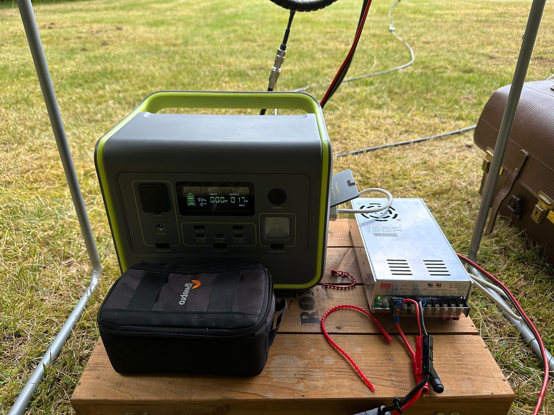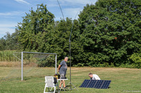 Gerhard nutzte die Gelegenheit, seine neue portable KW Urlaubsstation auszuprobieren: Die Stromversorgung erfolgt über ein 220W Faltpanel von Pluginfestivals mit einem LiFePO4 100Ah Akku. Als Antenne dient ein DP200 Teleskop-Dipol mit 2x 5,6m Fulsize Elementen für 14-50MHz. Bei 7MHz werden zwei Verlängerungsspulen und ein Hairpin-Match eingebaut. Nach erfolgreichem Test wird Gerhard dieses Set-up in den Urlaub nach OZ und SM mitnehmen.
