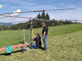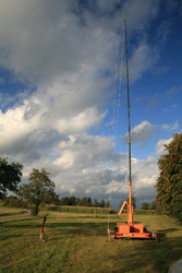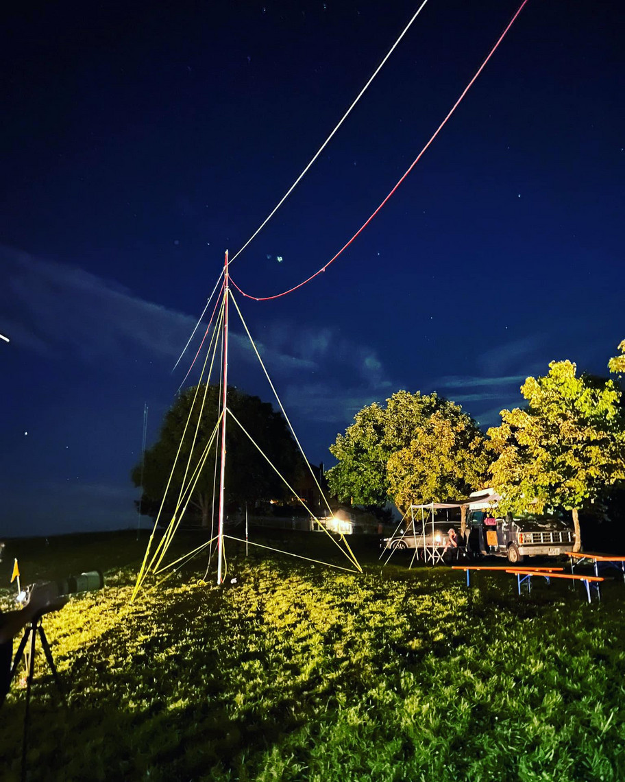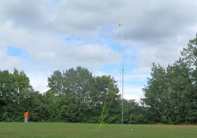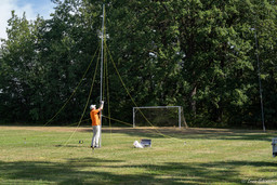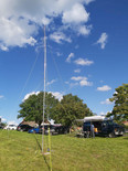 Nachdem Lothar uns beim Fieldday 2023 einen Drahtdipol aufgebaut hat beschäftigte er sich diesmal mit Antennenexperimenten zu einer Delta-Loop, für die er 100m-Antennenlitze zur Verfügung hatte. Nach dem Motto "viel hilf viel" ging es darum, wo die Antenne in Resonanz zu bringen ist, wie groß die Bandbreite ist und wie sich Veränderungen der Aufbauhöhe auswirken. Dazu hatte Lothar einen 10m-Alumast aufgebaut, an dem man bequem die Delta-Loop hoch- und runterlassen konnte, um Längenänderungen oder andere experimentelle Veränderungen (Balun) vorzunehmen.