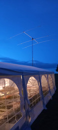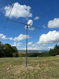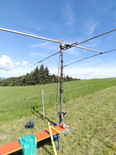 Aufgrund der Erfahrungen vom 2023er Fieldday mit dem FB33 Beam mit einem Gewinn von 6-7 dBd (aufwändiger Aufbau, schwer, teilweise defekte Sperrkreise) haben wir beschlossen, für den OV einen faltbaren 2 Element (Hexx-) Beam Gewinn 3-4 dBd von Foldingantennas anzuschaffen. Leider ist dieser aktuell nicht lieferbar. Daher haben wir uns für einen gebrauchten zum Drittel des Neupreises entschieden. Wie bei vielen gebrauchten Gerätschaften ist auch hier Nacharbeit und Fehlerkorrektur vonnöten. Gerhard hat über Nacht daheim die abgebrochenen Plastikbolzen durch Schraubenstangen ersetzt und mit der Hilfe von Walter und Schorsch wurden Flügelschrauben an den Gelenken angebracht. Der Aufbau hat sich somit um einen Tag verzögert. Des weiteren stellte sich heraus dass das Teile vom 20m Element abgerissen waren und ein Abstandsisolator fehlte. Somit brauchen wir vor dem WAG Fieldday noch eine Runde zur Reparatur und Abstimmung.