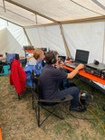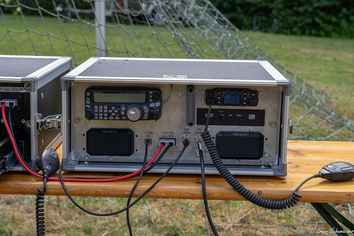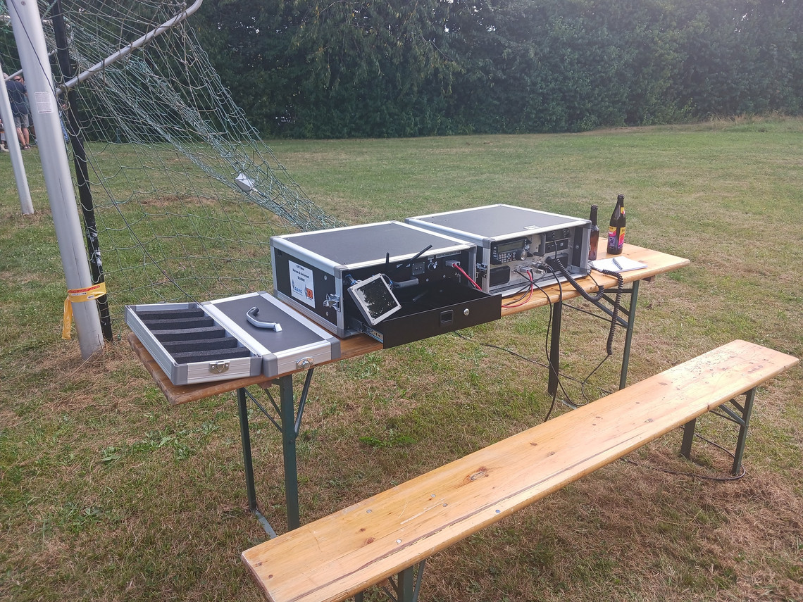 Auch für Ben war der Experimental Fieldday von P20 eine perfekte Gelegenheit um neue Technik aufzubauen und in der Praxis zu erproben. Er hatte sich dazu entschlossen dieses Jahr eine Notfunk Anlage aufzubauen und zu testen. Aufgebaut in einem Koffer „Strom & Internet“, welcher 30Ah Bleigel Akkus sowie eine Versorgung mit Internet und einen Raspberry PI für das Logprogramm besitzt, und einem zweiten Koffer „Funk & Kommunikation“. Dieser beinhaltet einen Kenwood TS480 SAT mit einem LDG Tuner, sowie ein Retevis RT 95 für UKW. Als Antenne hat Ben einen Langdraht von Bonito und eine Vertical mit Magnetfuss von Diamond benutzt.