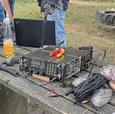 Eberhard hatte ein "Greenradio" dabei: Der PRC-2200(SA) wurde von Tadiran hergestellt, und in viele Länder der Welt verkauft. Der Transceiver selbst heißt RT-2001(SA). Im 100Hz- Raster wird der komplette Kurzwellenbereich von 1.6 bis 30 MHz abgedeckt. Der Akku hält ca 8h je nach Sendebetrieb. Die HF Leistung ist max. 20 Watt, mit der Möglichkeit drei unterschiedliche Antennen anzuschließen. Das besondere an diesem Gerät ist das Frequency Hopping, zu deutsch Frequenzsprungverfahren, das aber deaktiviert ist. Mit der angeschlossenen Antenne ist nicht so maßgeblich, daß das SWR klein ist, sondern viel bedeutender ist der Gewinn und das Vor-Rück-Verhältnis eine Antenne.