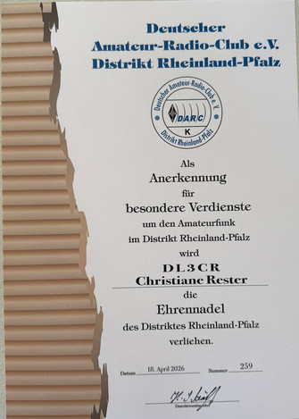 Am 18. April 2026 durfte Christiane Rester (DL3CR) das hohe Vergnügen haben, die Ehrennadel des Distrikts Rheinland-Pfalz in Empfang zu nehmen.