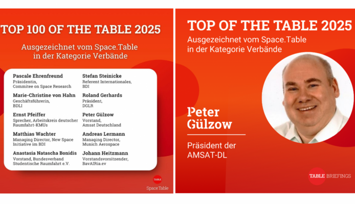 Die Space.Table-Redaktion hat die „Top 100 of the Table 2025/26“ veröffentlicht – eine Auswahl der einflussreichsten Persönlichkeiten aus Politik, Wissenschaft, Industrie, Verbänden, NGOs und der Raumfahrtszene insgesamt. Insgesamt gibt es zehn Kategorien, von Politik, Unternehmen, Beratung, Verbänden, Thinktanks bis Stiftungen, Wissenschaft, NGOs und Gesellschaft. In der Kategorie Verbände gehört Peter Gülzow, DB2OS, Präsident der AMSAT-Deutschland e.V., zu den zehn prägendsten Köpfen dieser Szene.