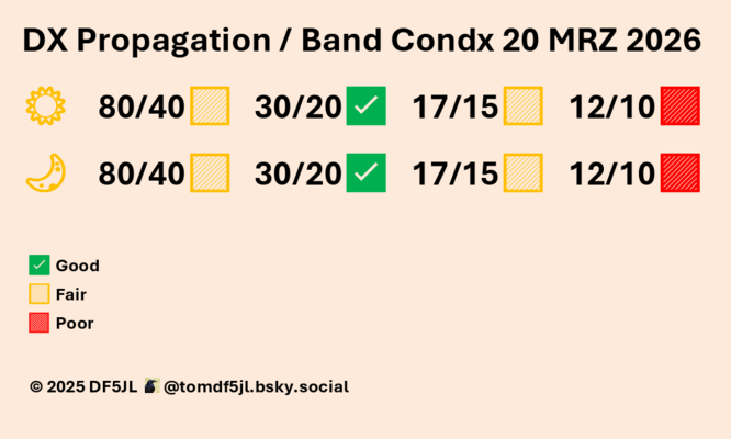 Der Einfluss eines ersten CMEs blieb unter den Erwartungen. Weitere, schwächere CMEs werden jedoch voraussichtlich am 20. und 21. März eintreffen. Zunächst wird eine unruhige bis aktive geomagnetische Aktivität erwartet, die zeitweise auf einen leicht stürmischen Wert von Kp 5 ansteigt, wobei vereinzelt Kp 6 möglich ist. Die Sonnenaktivität bleibt gering, vereinzelte M-Flares sind zu erwarten (M 15 % X 01 % Proton 01 %). Die Aussichten: Magnetsturmgefahr. Bis dahin brauchbare, teils gute HF-Bedingungen.