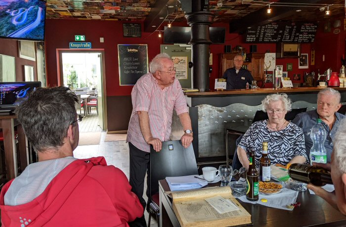 - Im Anschluß an den Vortrag kam es dann in kleinen Gruppen zu einer angeregten Disskussion teils über Ereignisse in der Vergangenheit des Ortsverbandes, teils über die Herausforderungen des Eigenbaus von Geräten und natürlich auch über die Perspektiven des Amateurfunks im Allgemeinen und des OV im Speziellen. Einige OM's hatten Unterlagen und Fotos aus alten Zeiten mitgebracht, andere Eigenbauobjekte, die dann im Mittelpunkt der jeweiligen Diskussion standen.