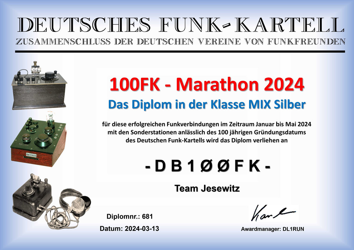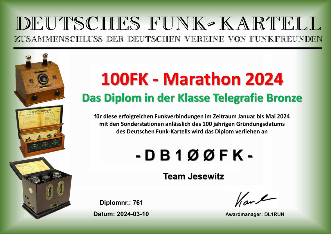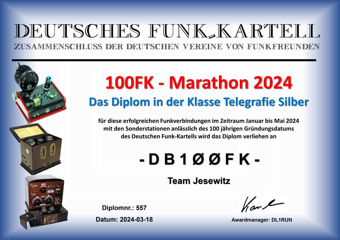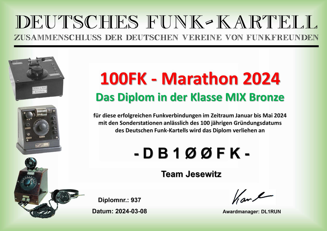 Vom 1.Januar bis 31.Mai 2024 wurde an die Gründung des Deutschen Funk-Kartells vor 100 Jahren mit einem Funkevent erinnert. Aus diesem Anlaß waren zehn Sonderstationen mit Sonder-DOK auf den Bändern aktiv.