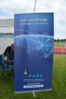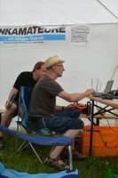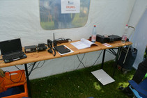 Ab ca. 8.00 Uhr waren K.-H., Steffen und Norbert schon fleißig am Aufbauen. Ich kam erst kurz nach 9.00 Uhr dazu. Unsere Funker-Behausung bildete ein Party-Zelt. Steffen hatte seine 40 m lange "Endfeed" für KW und seine FT-8 Technik, kleiner Lappy und ein FT-817, mitgebracht. Die Endfeed war von einem Gebäude quer über den Fußweg zu einem Teleskopmast am Rand eines der beiden Sportplätze gespannt. Wir mussten uns beim Aufspannen beeilen, damit keine Besucher im Draht hängen blieben.