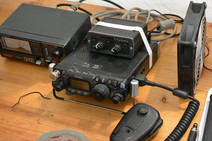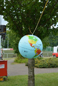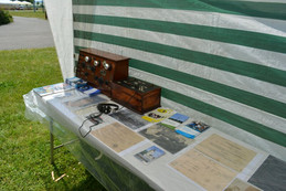 Neben dieser historischen Technik lagen Prospekte und AFU-Zeitschriften als Infomaterial aus. Karl-Heinz hatte organisiert was ging. Das 230 V Stromkabel hing überkopf von Baum zu Baum gespannt, damit keiner darüber stolpert und sich verletzt. Am Kabel baumelte ein aufblasbarer Globus mit geschätzt 42 cm Durchmesser und wanderte vom Wind getrieben am Kabel hin und her. Er hatte mich einige Atemluft gekostet bis er prall wurde. Direkt neben uns standen die Vertreter des "Herrn", womit gutes Wetter garantiert war. Der Pfarrer wolle ein gutes Wort für uns einlegen, versprach er. Auch eine Dame vom Kindergarten Großschirma und der Heimatverein hatten sich neben uns niedergelassen. Weiter weg waren die freiwillige Feuerwehr und andere Vereine present. Der DJ agierte rücksichtsvoll und regelte wärend der Veranstaltung die Lautstärke seiner Audio-Aussendungen auf ein verträgliches Maß. Trotzdem blieb es akustisch manchmal ein Durcheinander und beim Funken eine Herausforderung im Bezug auf das fehlerfreie Hören. Auch ein Grund, warum nicht viele QSOs zustande kamen.