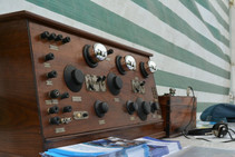 Norbert steuerte seinen IC-7000 und eine 2 m/70 cm 2-Element Richtantenne nebst kleinem Mast bei. Sobald wir die Bedienung des IC-7000 erlernt hatten, konnten wir sogar damit funken ;-). Die alten Kisten, ohne Menues, hatten auch Vorteile. Aufgrund der einzigen KW-Antenne konnte immer nur entweder FT-8 am FT-817 oder CW/SSB am IC-7000 auf KW gemacht werden. Wir mussten die Antenne also immer umstecken. Ganze 3 QSOs gelangen in CW und einige wenige in FT-8. Zum Glück hatte ich meine Morsetaste mitgebracht. Die CW Funker unter uns werden langsam rar. Handys liefen immer im Hintergrund mit. Viel war auf den Bändern nicht los. Die alten Zeiten, in denen auch ohne Contest viele OMs aktiv waren sind selten geworden. Egal, es ging ja hauptsächlich um die praktische Presentation unseres schönen Hobbys in der Öffentlichkeit und um Kontakt zu unseren Mitmenschen. Im Funkerzelt war, Sicht beim Reingehen betrachtet, auf der rechten Seite die o. g. Funktechnik aufgebaut. Gegenüber stand ein originaler historischer Detektorempänger aus den 20igern des vorigen Jahrhunderts. Dessen Inbetriebnahme mit Endfeed-Antenne scheiterte jedoch am nicht vorhandenen passenden Adapter. Murphy hatte sich bei uns eingeschlichen.