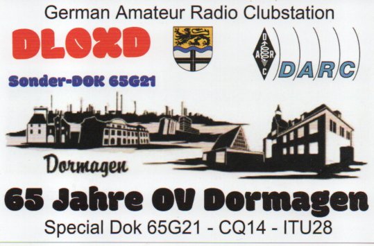 der DARC-Ortsverband Dormagen G21 feiert im Jahr 2026 sein 65-jähriges Bestehen. Zu diesem Anlass vergibt unsere Clubstation DL0XD im Rahmen eines Jubiläumsdiploms, den Sonder-DOK 65G21. Das Diplom wird in der Zeit vom 01.01.2026 bis 31.12.2026 vergeben. Dabei müssen 15 Punkte erarbeitet werden. Alle Bänder und Betriebsarten sind erlaubt. Die Clubstation DL0XD (mit Sonder-DOK 65G21) zählt pro Tag und Band 6 Punkte. Funkverbindungen mit Mitgliedern vom OV G21 zählen pro Tag und Band 3 Punkte. Wer also die Clubstation DL0XD gearbeitet hat und gleichzeitig den Operator hat bereits 9 Punkte gesammelt und benötigt nur noch 2 weitere G21 Kontakte.