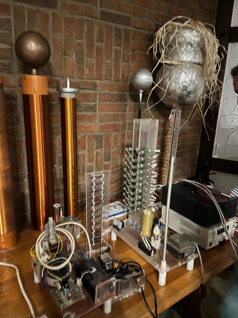 Peter hat zuerst die theoretischen Grundlagen von Teslaspulen, Marxgeneratoren, Can Crusher (Dosenzerstörer) und Cockcroft-Walton Multiplier erklärt. Dann folgte der praktische Teil mit Vorführung aller in der Theorie behandelten Geräten. Die folgenden Bilder geben einen Eindruck.