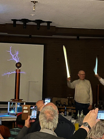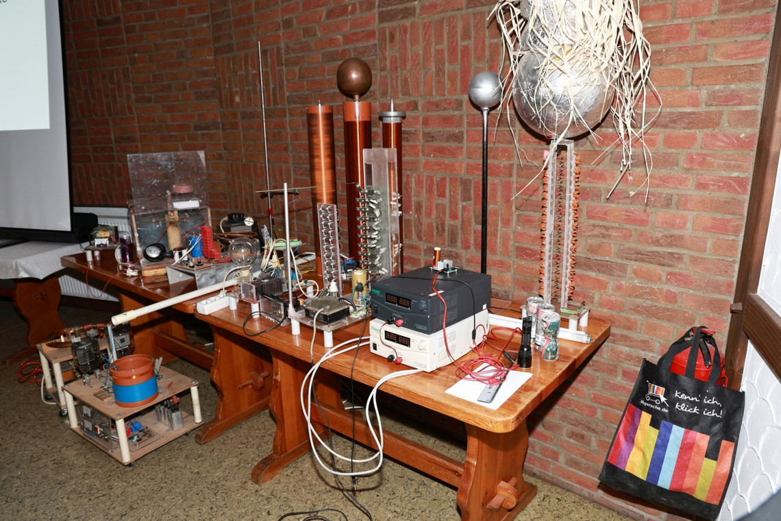 Am 14. März 2025 hat Dr. Peter Verhülsdonk DL2KDF einen Vortrag über Hochspannungs Generatoren mit praktischer Vorführung im großen Saal des Lammersdorfer Hof gehalten. Der Saal war mit 65 Personen gut gefüllt.